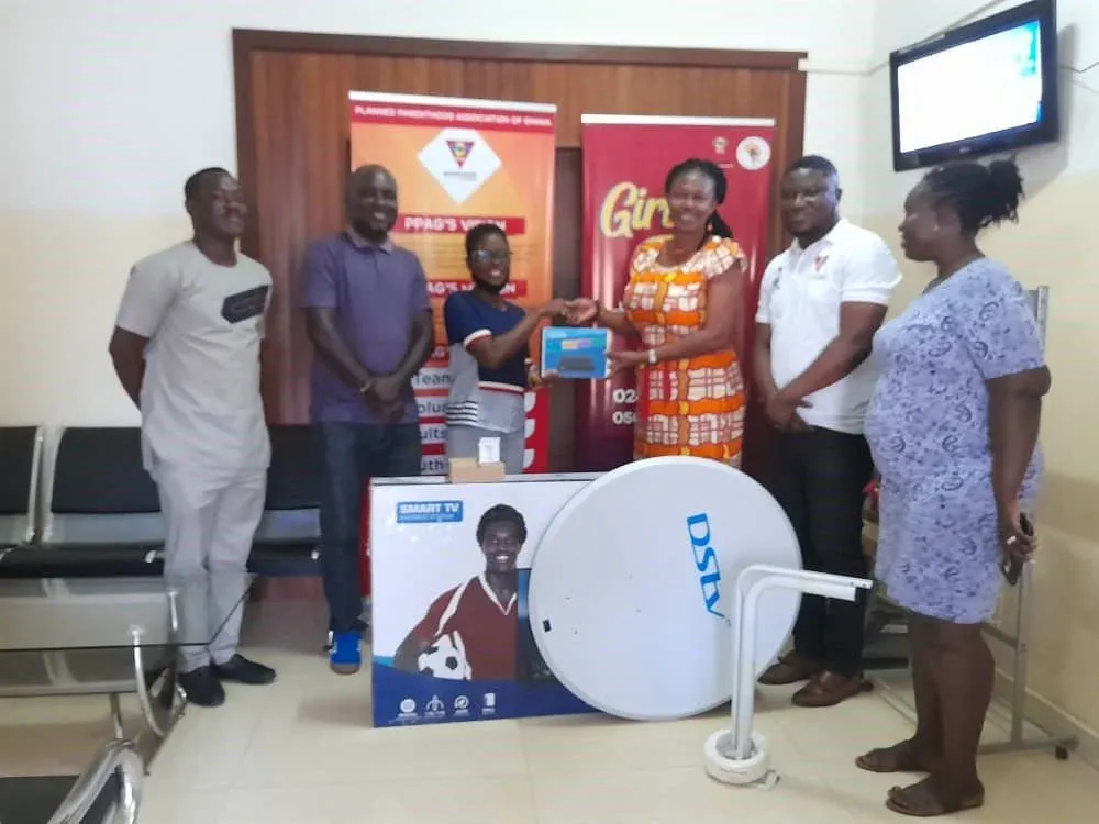 Former Youth Facilitators, Volunteers and Users of PPAG Accra Young & Wise Resource Centre, presented a 50” flat screen TV, DSTV Decoder with a Dish and its wall mount to the Association on the 15th October, 2020. The gesture was to show their appreciation for the amazing education and impact the Centre made in their lives and career.